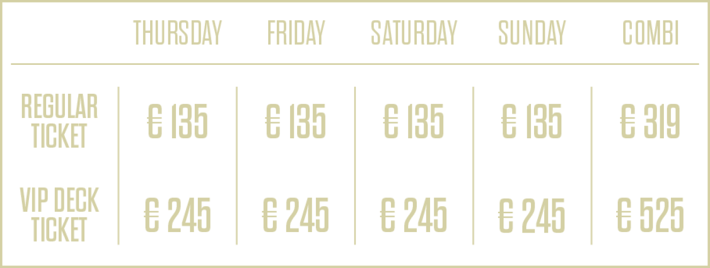 Les prix incluent les frais de service. Aucuns frais de paiement ne sont portés en compte. Le voyage en train n'est pas inclus. Achetez vos tickets uniquement via les canaux officiels. Les tickets revendus à un prix excessif seront placés sur la liste noire et ne donneront pas accès au festival. L'achat d'un ticket implique l'acceptation des conditions générales de vente.