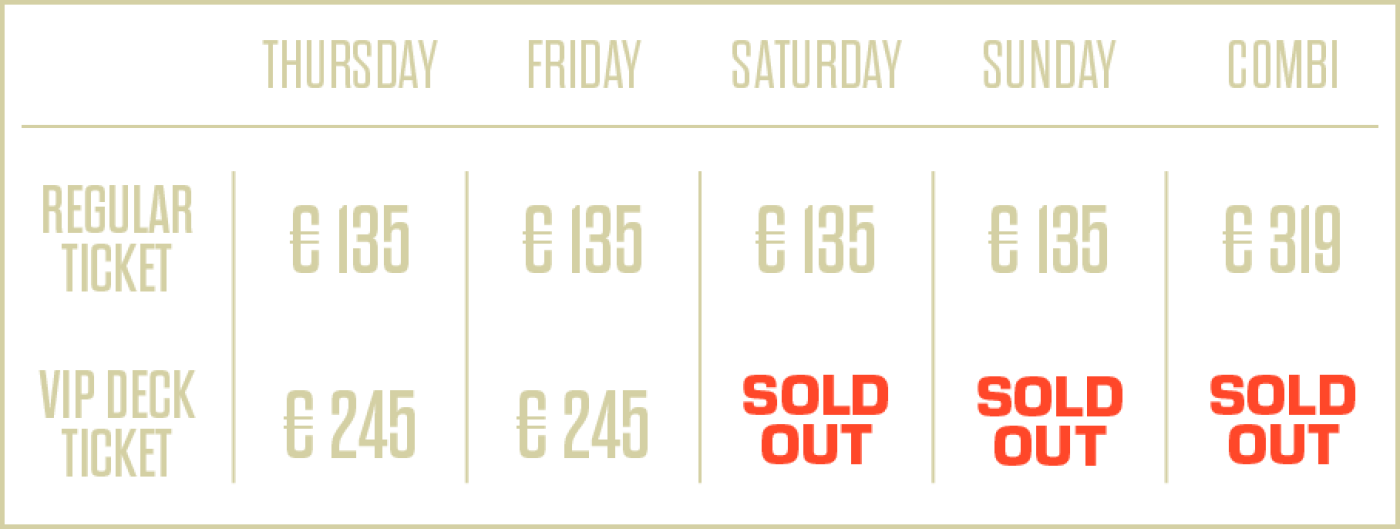 Important: The Belgian government has announced a VAT increase on festival and concert tickets, from 6% to 12%. Details on implementation and timing are still pending, but price adjustments may follow. Book your tickets today to benefit from current pricing.